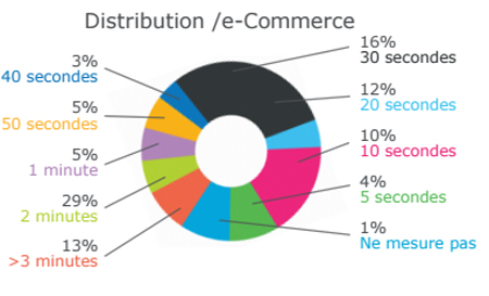 Si, tous secteurs confondus, 50% des marques déclarent répondre aux appels téléphoniques dans les 30 secondes, elles ne sont que 42% sur le secteur du retail et du e-commerce. Elles sont même 13 % à reconnaître que le temps moyen de réponse aux appels téléphoniques dépasse les 3 minutes une éternité pour le consommateur (cf. graphique ci-dessous).