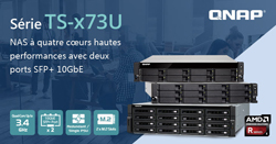 QNAP® Systems, Inc. a annoncé aujourd’hui sa nouvelle gamme NAS professionnelle TS-x73U équipée d’un processeur AMD et disponible en modèles 8, 12 et 16 baies avec options d’alimentation simple ou redondante. Avec un processeur quadruple-cœur hautes performances AMD Embedded R-Series RX-421ND (fréquence de 2,1 GHz de base et 3,4 GHz au maximum), une carte réseau double port SFP+ 10GbE préinstallée et deux emplacements pour SSD M.2 SATA 6 Gb/s (pour tirer profit d’un cache SSD et de l’efficacité de stockage optimisée par la technologie Qtier™), la gamme TS-x73U est idéale pour les entreprises à la recherche d’un Cloud privé sécurisé et d’une infrastructure réseau 10GbE efficace..
