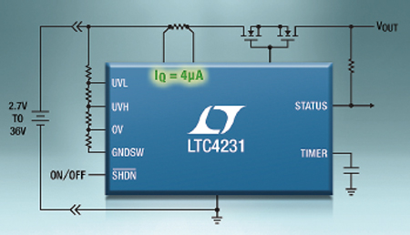 Figure 2. Le contrôleur et coupe-circuit LTC4231, activable en cours de fonctionnement, ne consomme que 4 μA de courant de repos. Une solution idéale pour les systèmes alimentés par batterie