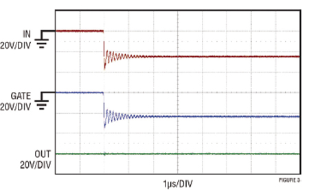 Figure 3. En cas d’insertion d’une batterie avec inversion des polarités, par exemple - 24 V sur l’entrée IN, le contrôleur LTC4231 protège la charge en bloquant la propagation de la tension négative vers la sortie (OUT). Les transistors MOSFET dos-à-dos (représentés sur la Figure 2) sont nécessaires pour assurer la protection de l’entrée contre l’inversion des polarités.