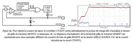 Le circuit LTC4231 utilise deux techniques innovantes pour réduire la consommation de courant en fonctionnement normal tout en assurant une protection tout à fait inégalée par rapport à d’autres contrôleurs énergivores. Pour activer les transistors MOSFET à canal N externes et réduire leur résistance à l’état passant, le contrôleur LTC4231 utilise une pompe de charge interne afin de générer une tension de grille d’au moins 10 V audessus de la tension d’entrée. Pour d’autres contrôleurs, la pompe de charge fonctionne en permanence, même lorsque les grilles sont activées, conduisant pour l’essentiel à un état de repos, mais avec une contribution significative au courant de repos. En revanche, le circuit LTC4231 désactive la pompe de charge dès que la grille du transistor MOSFET atteint sa tension crête. Si la tension de grille chute sous l’effet d’une fuite, la pompe de charge est activée pour générer une impulsion de charge, actualisant ainsi la tension de grille. Cette situation est illustrée par la Figure 4, par exemple pour des intensités de fuite de 0,1 μA et 1 μA au niveau de la grille. Cette technique permet de diviser par 50 à 100 le courant de la pompe de charge, avec une intensité de 200 μA lorsqu’elle est active, mais seulement 2 μA en mode Veille.