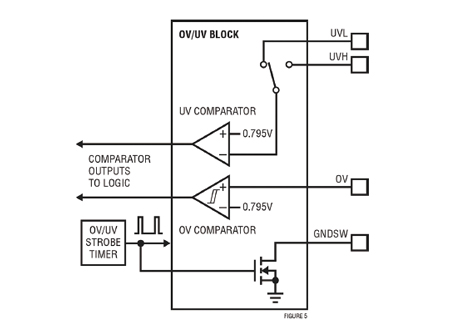 La deuxième technique pour réduire le courant de repos du circuit LTC4231 consiste à échantillonner la tension d’entrée toutes les 10 ms pour déterminer si elle a atteint le seuil de tension minimale (sous-tension) ou maximale (surtension). Une connexion de masse échantillonnée (GNDSW) est prévue pour le diviseur résistif appliqué à la tension d’entrée externe (Figure 5). L’échantillonnage périodique permet de diviser par 50 le courant absorbé par le diviseur résistif. Ce facteur de 50 est obtenu en divisant la période d’échantillonnage (10 ms) par la durée de la fenêtre d’échantillonnage (200 μs). Les comparateurs chargés de contrôler les broches UVL, UVH et OV sont activés pendant la fenêtre d’échantillonnage, ce qui divise également par 50 le courant absorbé moyen. Une période d’échantillonnage de 10 ms fonctionne bien pour les batteries puisque leur tension n’évolue que lentement au fil du temps. Cependant, en situation de minimum (sous-tension) ou de maximum de tension (surtension) au démarrage, le contrôleur LTC4231 bloque les transistors MOSFET pour empêcher la tension située hors de cet intervalle de se propager jusqu’à la charge.