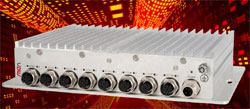 Tous les composants électriques sont soudés pour résister aux chocs et aux vibrations, et sont protégés contre la poussière et l’humidité par tropicalisation. Les canaux Ethernet sont accessibles en face avant via des connecteurs durcis M12.