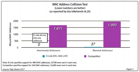Le groupe Tolly a également effectué des tests sur le commutateur administré empilable DXS-3400-24TC 10GbE de D-Link. Il a été reconnu qu’il devançait les produits concurrents dans les tests de collision d’adresses MAC, démontrant ainsi sa capacité à offrir des performances réseau optimales. Testé avec des adresses incrémentales, puis des adresses générées de manière aléatoire, le commutateur de D-Link n’a manqué aucune adresse dans le test MAC incrémental, alors que le concurrent en a manquées plus de 1 500. Dans le test aléatoire, le commutateur de D-Link a manqué seulement 37 adresses, alors que les concurrents ont manqué près de 2 000 adresses.