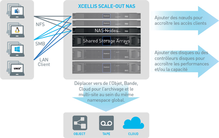 Évolutivité économique des performances et de la capacité : il est possible d’étendre en même temps ou séparément les performances (jusqu’à plusieurs téraoctets par seconde) et la capacité (jusqu’à des centaines de pétaoctets) des clusters. Les performances d’un seul client (SMB, NFS ou hautes performances) sont plus de trois fois supérieures à celles des solutions NAS en mode « scale-out » concurrentes. Avec plusieurs clients, la bande passante d’un seul cluster dépasse un téraoctet par seconde. Xcellis a de plus démontré sa capacité à gérer plusieurs pétaoctets de données dans un workflow simplifié intégrant la bande ou le Cloud, avec des performances supérieures à celles des principales solutions concurrentes exclusivement NAS, pour un coût divisé par dix.