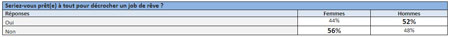 Pour réussir à décrocher le job dont les Français rêvent, ils ne semblent pas tous être prêts à faire n’importe quoi. Ainsi, les hommes sont 52% à avouer être capables de tout pour avoir un meilleur travail quand les femmes disent l’inverse à 56%.