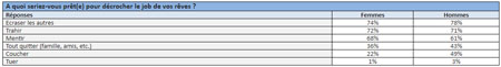 Parmi le classement des actes dont les Français seraient capables pour décrocher le travail de leurs rêves, c’est le fait d’écraser les autres qui arrivent en tête pour plus de 74% des femmes et 78% des hommes interrogés. La trahison arrive en deuxième place pour 72% des femmes et 71% des hommes, juste devant le mensonge pour 68% des femmes et 61% des hommes. 36% des femmes et 43% des hommes peuvent tout abandonner pour un meilleur travail et si 49% des hommes sont même prêts à coucher pour y arriver seulement 22% des femmes en sont capables. Enfin, et bien heureusement, seulement 1% des femmes et 3% des hommes se disent prêts à tuer pour décrocher le job de leur rêve.