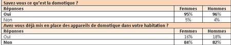 Plus de 95% des Français déclarent savoir ce que représente l’univers de la domotique (95% pour les femmes et 96% pour les hommes). En revanche, ils ne sont que 17% à avoir déjà mis en place des appareils de domotique dans leur habitation (16% pour les femmes et 18% pour les hommes).