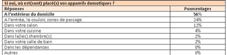 Pour les personnes déjà équipées, les appareils de domotique se situent principalement à l’extérieur de l’habitation pour 56% des personnes interrogées. En deuxième position se trouvent les entrées et les zones de passage à 24%, suivies du salon avec 12%.