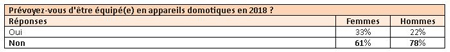 Conséquence logique, peu de personnes envisagent de s’équiper en matériels domotiques durant l’année 2018. En effet, seulement 33% des femmes et 22% des hommes avouent être prêts à acheter des appareils de domotique cette année.