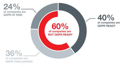 60 % des entreprises européennes ne sont pas « prêtes pour le RGPD », un quart d’entre elles (24 %) étant considérées comme « à risque en ce qui concerne le RGPD » et 36 % « en difficulté par rapport au RGPD », ce qui représente potentiellement des dizaines de milliards d’amendes