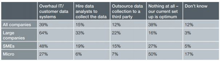 En ce qui concerne leur planification en vue du RGPD, les entreprises françaises ne semblent pas pressées d’effectuer de changements importants, malgré le manque de préparation. La majorité des entreprises françaises (52 %) ne savent pas quelles mesures va prendre leur organisation, ou disent que leur configuration actuelle est déjà optimale (respectivement 18 % et 34 %). Cependant, 34 % prévoient de réorganiser leurs systèmes de données informatiques/clients, et 16 % envisagent d’externaliser leurs données à un tiers. À travers l’UE, les grandes entreprises sont plus proactives. Deux tiers d’entre elles (64 %) vont restructurer leur système informatique, et un tiers (33 %) embaucheront des analystes.