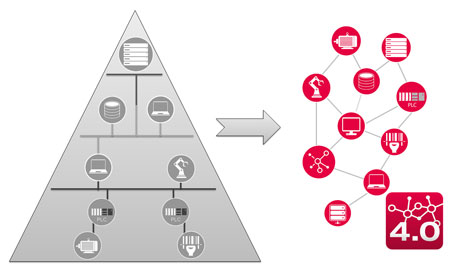 L’objectif premier d’Industrie 4.0 est de rendre disponible des informations provenant de différentes sources et de les relier entre elles. Il convient d’abord d’opérer une distinction quant à la provenance des informations. À cet effet, la pyramide d’automatisation ou le modèle d’architecture de référence RAMI 4.0 peuvent servir d’orientation : il y a d’une part, des informations qui sont générées au niveau du terrain ou de la commande et d’autre part, des informations qui sont gérées de manière centralisée, par exemple dans les systèmes ERP. Ce faisant, il est essentiel de tenir compte du fait que les informations à relier ne sont pas seulement disponibles au sein d’une entreprise, mais doivent être échangées au-delà des frontières de celle-ci. Les valeurs ajoutées et les modèles d’activité qui font l’objet de discussions dans le contexte d’Industrie 4.0, naissent en grande partie du fait que les informations provenant de différentes sources sont collectées au niveau du terrain et combinées avec des informations disponibles à un niveau centralisé en vue de l’acquisition de nouvelles connaissances.