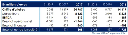 Le résultat financier s’élève à -0,3 M€ en 2017. Après impôt, le résultat net de l’exercice 2017 est légèrement négatif à hauteur de 0,3 M€ contre -1,7 M€ en 2016.