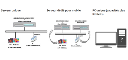 En fonction du type d’utilisation souhaitée, trois types d’architectures peuvent être employées : Serveur unique, Serveur dédié pour mobile ou PC unique (capacités plus limitées). Toutefois,il est conseillé d’utiliser l’architecture serveur unique ou serveur dédié. Le mode PC unique étant plus limité et quelque peu contraignant.