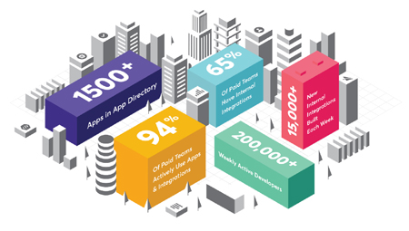 Nous avons assisté à une croissance significative de notre communauté de développeurs. Outre des développeurs qui travaillent pour notre répertoire d’applications, nos clients mettent eux-même en place des intégrations internes qui adaptent Slack à leurs besoins spécifiques.