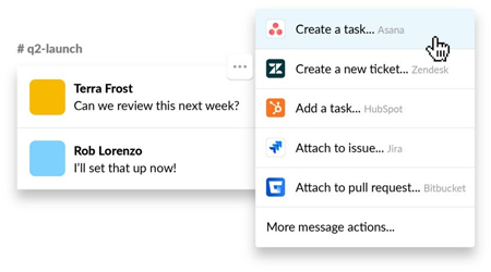 Les Actions nouvellement publiées vous permettent de créer une tâche, un commentaire ou un suivi à partir de n’importe quel message Slack dans d’autres outils comme Zendesk, Asana, Hubspot, Bitbucket, Jira, et plus encore. Par exemple, lorsqu’un collègue vous fait une demande via Slack, vous pouvez transformer le message avec sa demande en une tâche Asana en quelques clics.