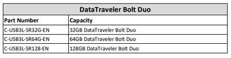 La DataTraveler Duo Bolt est disponible en 32GB, 64GB et 128GB et est protégée par une garantie de 2 ans, un support technique gratuit et la légendaire fiabilité Kingston.