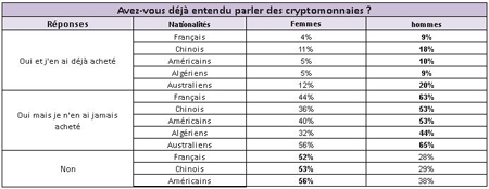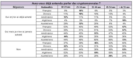 A la question " Avez-vous déjà entendu parler des cryptomonnaies ?", les Australiens sont clairement les plus connaisseurs. Ainsi, Ils sont 76% à avoir entendu parler des cryptomonnaies, juste devant les Chinois avec 60%, alors que les Américains sont à 53%, les Algériens à 45% et les Français à 59%. Les Australiens sont toujours premiers du classement en déclarant à 16% en avoir acheté, suivis de près par la Chine (15%). Les Français, Algériens et Américains sont seulement à 6 et 7% de déclaration d’achat.