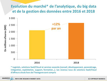En France, MARKESS estime que le marché de l’analytique, du big data et de la gestion des données augmentera de 12% entre 2016 et 2018 pour atteindre 2 500 millions d’euros à la fin de l’année.