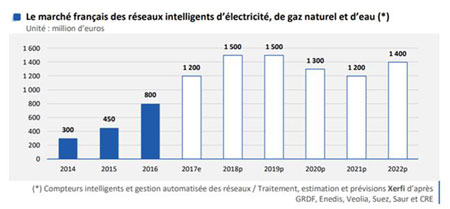 Selon Xerfi, les quatre prochaines années devraient être déterminantes pour le marché des smartgrids en France. Ainsi 2018-2022, le marché des réseaux intelligents d’électricité, de gaz et d’eau devrait passer de 800 millions d’euros en 2016 à 1,5 milliard en 2018 et pour représenter 1,4 milliard d’euros en 2022.
