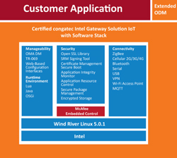 Intel, leader des processeurs et des plates-formes, s’est vite rendu compte que la sécurité était le principal obstacle pour accéder massivement à l’internet des objets. En coopération avec ses filiales Wind River et McAfee, Intel a développé une solution sécurisée de bout-en-bout à partir d’une seule source. Cette solution associe les produits et l’expertise propre à chaque société pour les plates-formes concernées, comme la famille Intel Atom-38xx. Wind River fournit Wind River Intelligent Device Platform XT qui comprend le système d’exploitation Wind River Linux 5.0, les piles logicielles pré-validées, les pilotes hardware et les bibliothèques et outils correspondants.