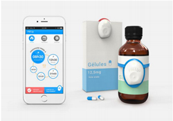 Un bouton « intelligent » à coller sur l’emballage des médicaments (flacon, emballage cartonné,…) qui aide le patient à identifier le(s) médicament(s) à prendre par un signal lumineux Une application disponible sur son Smartphone personnel qui signale au patient l’heure de prise de son médicament par un signal sonore et/ou vibrant