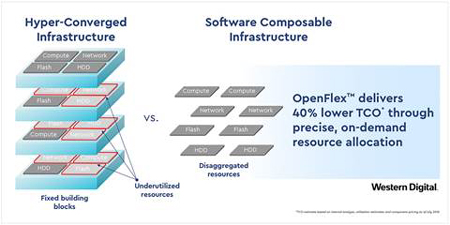 Conçue à partir de la technologie standard de l’industrie NVMf, l’architecture OpenFlex de Western Digital crée des groupes de flash et de disques évoluant indépendamment, pouvant être connectés à des ressources informatiques grâce à des technologies de réseaux traditionnelles telles que l’Ethernet. L’API Kingfish permet aux groupes de flash et de disques d’être présentés sous forme d’infrastructures logicielles composables pouvant être rapidement et facilement orchestrées au sein de serveurs d’application logiques. En comparaison aux infrastructures hyperconvergées (HCI ou hyperconverged infrastructure), présentant un ratio fixe de ressources informatiques, de stockage et de réseau, l’architecture et les produits OpenFlex peuvent réduire le coût total de possession (TCO) jusqu’à 40%1, en éliminant les ressources peu utilisées. L’évolutivité très fine d’OpenFlex peut également réduire l’investissement initial en infrastructure de près de 50%2. De plus, les ressources désagrégées étant directement connectées, les performances des applications peuvent être plus prévisibles, les serveurs logiques étant moins susceptibles d’être soumis aux charges de travail « bruyantes », en compétition pour les mêmes ressources et chemins de données.