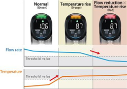 Grâce à une technologie unique, ces nouveaux capteurs assurent une double surveillance des principaux paramètres de débit ou de pression. De plus, ils permettent de réguler la température et peuvent détecter des défaillances qu’ils signalent par le biais de signaux lumineux de couleur et indiquent clairement à travers un indicateur organique noir et blanc à haute visibilité.