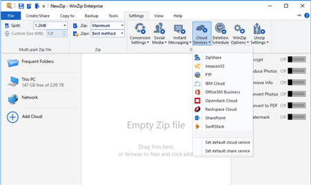 WinZip® 23 Enterprise offre la possibilité de s’intégrer à plusieurs réseaux utilisant différents services de stockage Cloud, notamment les régions AWS (y compris GovCloud), ainsi qu’IBM Cloud, SwiftStack, RackSpace et OpenStack, afin de répondre aux exigences de l’infrastructure réseau d’une entreprise. WinZip® 23 Enterprise continue de s’intégrer directement aux services SaaS d’entreprise standard SharePoint et Office365, et peut être configuré afin d’offrir un accès optionnel à Google Drive, Dropbox, Box, OneDrive, CloudMe, SugarSync et MediaFire.