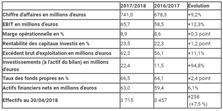 Une fois de plus, le groupe est parvenu à augmenter sa rentabilité. Cette évolution s’explique principalement par la forte croissance du chiffre d’affaires. Le résultat d’exploitation a également établi un nouveau record avec une hausse de 12,3% pour atteindre 65,7 millions €. La marge opérationnelle a atteint 8,9 %. La rentabilité des capitaux investis (ROCE) a progressé de 1,2 % pour passer à 23,5 % en 2017/2018 (contre 22,3 % l’exercice précédent).
