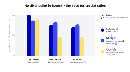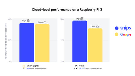 Ci-dessous, les performances de la plateforme vocale embarquée Snips comparé à des services équivalents basés sur le cloud. Dans les domaines du vocabulaire réduit inhérent aux lumières intelligentes, et de celui du vocabulaire large associé à la musique, la performance de la plateforme vocale Snips est proche du niveau de compréhension humain, et équivalente, voire meilleure que les services basés sur le cloud.
