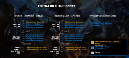 Les 8 équipes engagées s’affronteront dans un format aller et retour pendant la saison régulière, puis au meilleur des 5 manches durant les phases finales. Les écuries les plus performantes de la ligue gagneront le droit de défier leurs concurrents européens lors des European Masters, le plus haut niveau des compétitions européennes après le LEC.