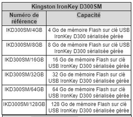 La clé IronKey D300SM est disponible dans des capacités de 4 Go et 128 Go et bénéficie d’une garantie limitée de cinq ans, d’un support technique gratuit et de la légendaire fiabilité Kingston.