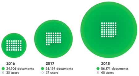 DocuWare continuant de figurer dans la stratégie cloud des entreprises, son adoption et son utilisation se sont développées. Le nombre d’utilisateurs et les documents archivés par client ont augmenté respectivement de 37 et 126 % entre 2016 et 2018.