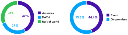 Les clients de DocuWare Cloud sont basés en Amérique du Nord et du Sud (42 %), dans la région DACH* (27 %) et dans le reste du monde (31 %). En 2018, près de la moitié des clients ont préféré DocuWare Cloud à nos services sur site.
