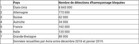 Une étude, réalisée il y a deux mois sur des tentatives d’hameçonnage bloquées tirées d’un échantillon d’utilisateurs d’Avira, révèle des différences entre la plupart des pays dans les niveaux de tentatives d’hameçonnage. Toutefois, un pays surpasse tous les autres à la fois dans le nombre total de tentatives d’hameçonnage bloquées et la fréquence par habitant, lorsqu’ajusté à la population. Ce sont les États-Unis.