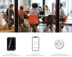 Allure UNITOUCH offre une nouvelle expérience aux utilisateurs grâce à son interface conviviale et intuitive. Avec sa technologie Bluetooth® Low Energy intégrée, cette sonde peut être associée à un smartphone afin de régler rapidement et en toute simplicité, les paramètres de confort d’une pièce tels que le CVC, l’éclairage et les stores. Le multi-capteur EC-Multi-Sensor-BLE comprend un détecteur de mouvement, un capteur de lumière ou encore un émetteur-récepteur doté de la technologie Bluetooth® Low Energy. L’ensemble assure un contrôle facilité des paramètres de confort dans les bâtiments.