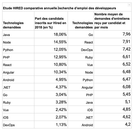 En moyenne, les développeurs inscrits sur la plateforme Hired ont reçu en 2018, 6 propositions d’entretiens par mois, toutes technologies confondues. Pour ceux maîtrisant Go, React et DevOps, le nombre de demandes d’entretien était de 30 % à 21 % plus élevé que le moyenne. En revanche, les développeurs Android, .NET et iOS reçoivent de 31 % à 21 % de propositions en moins que la moyenne.