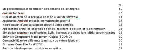 Les acheteurs d’équipements informatiques mobiles considèrent que les capacités de gestion offertes par un terminal Android professionnel doivent répondre aux fonctionnalités suivantes :