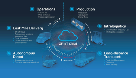 « Avec notre plateforme IoT, nous avons créé un outil important pour faire avancer activement la numérisation de la logistique », déclare Klaus Geißdörfer, Directeur de la division Technologie industrielle chez ZF. « Le cloud de ZF constitue la base pour relier intelligemment les innovations des secteurs des véhicules particuliers et utilitaires aux systèmes technologiques industriels. »