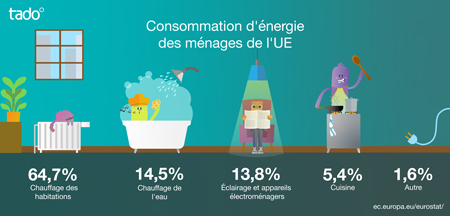 Dans les ménages de l’Union Européenne, le chauffage et l’eau chaude représentent à eux seuls 79 % de la consommation totale d’énergie. L’éclairage et les appareils électroménagers ne représentent ensemble que 14 % de la consommation d’énergie des ménages de l’UE.