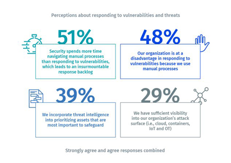 Une gestion de la vulnérabilité rendue difficile par les processus manuels et le manque de personnel : une majorité de professionnels reconnaissent le manque de personnel (61 %) et le recours à des processus manuels (55 %) comme étant des obstacles majeurs à la capacité à évaluer et corriger les vulnérabilités.