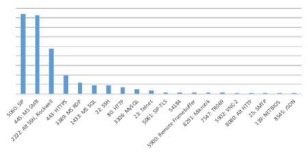 En Europe, le port 5060 est celui qui a subi le plus d’attaques. Il est utilisé par le service SIP (Session Initiation Protocol) pour la connectivité VoIP (Voice over IP) aux téléphones et aux systèmes de vidéoconférence. L’analyse du trafic d’attaque visant une destination spécifique lors d’événements mondiaux majeurs, tels que les récents sommets entre Donald Trump et Kim Jung Un ou encore Vladimir Poutine, montre que ce port est systématiquement pris pour cible. Le port 445, dédié à Microsoft Server Message Block (SMB), est le deuxième le plus attaqué, devant le port 2222, couramment utilisé en tant que port Secure Shell (SSH) non standard.