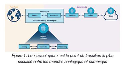 La mise en oeuvre de fonctions de sécurité appropriées doit avoir lieu le plus tôt possible de préférence dès le début de la chaîne de signal du système, c’est-à-dire au point de transition entre le monde réel, physique, et le monde numérique. Ce point, également appelé « point d’équilibre » ou sweet spot, semble être le plus intéressant au sein de la chaîne du signal. Il s’agit généralement d’un capteur ou d’un actionneur. Ici, le codage de données fiables est relativement peu complexe, ce qui augmente également la confiance accordée aux décisions prises sur la base de ces données. Toutefois, comme le montre la Figure 1, ce sweet spot requiert un degré élevé d’identité matérielle et d’intégrité des données pour maximiser la sécurité des données et donc la confiance qu’accordent les systèmes d’exploitation aux données sécurisées. La mise en oeuvre des identités et de l’intégrité qui existent déjà au niveau matériel c’est-à-dire les fonctions de protection déjà intégrées au silicium représente l’approche la plus prometteuse pour assurer la sécurité des données. C’est ici que commence ce que l’on appelle la « racine de confiance ».