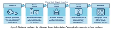 L’expression « racine de confiance » désigne un ensemble de fonctions de sécurité connexes qui contrôlent le processus de cryptographie au sein des appareils et constitue une unité de calcul largement indépendante. Dans ce cas, l’émission sécurisée de données est généralement générée en contrôlant les éléments matériels et logiciels au fil d’étapes successives. Comme le montre la Figure 2, l’enchaînement de ces différentes étapes garantit que la transmission des données se déroule comme souhaité et sans dommage. On supposera alors que l’application est correctement protégée.