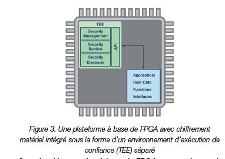 La technologie de cybersécurité de CSS, ou plutôt l’ensemble des fonctions de sécurité qu’elle inclut sont généralement implémentées sur un sous-système distinct piloté par un FPGA, qui fonctionne parallèlement aux fonctions applicatives de la puce. Cet environnement d’exécution fiabilisé (TEE : Trusted Execution Environment) est représenté en Figure 3.