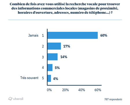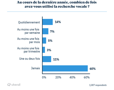 Selon l’enquête, 21% des sondés utilisent la recherche vocale chaque semaine, alors que 60% des personnes interrogées affirment ne jamais l’utiliser. Ces résultats montrent que l’utilisation de la recherche vocale par les consommateurs est soit très fréquente (quotidienne ou hebdomadaire), soit totalement inexistante.