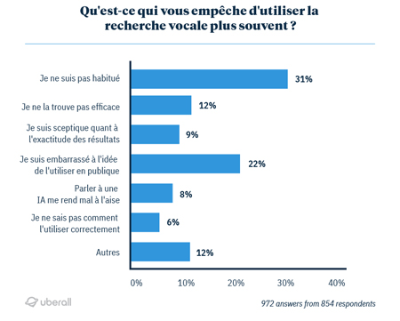 Le rapport analyse également les raisons qui freinent les utilisateurs à utiliser la recherche vocale plus fréquemment. Les trois causes principales qui se dégagent sont le fait qu’ils n’y sont pas encore habitués (31%), qu’ils sont embarrassés à l’idée de l’utiliser en public (22%) ou tout simplement qu’ils ne pensent pas qu’il s’agisse du moyen de recherche le plus efficace (12%). « Il est clair que les technologies de recherche vocale doivent gagner en praticité et en pertinence si elles souhaitent gagner l’approbation du grand public », a déclaré Norman.