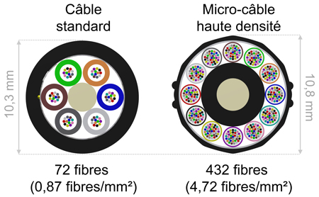 Les micro-câbles sont jusqu’à 60 % plus petits et 70 % plus légers que les câbles tubulaires non-torsadés traditionnels. Aujourd’hui, un micro-câble contient 432 fibres d’un diamètre extérieur de 10,8 mm, soit seulement 0,5 mm de plus que le plus petit câble tubulaire libre standard (72 fibres d’un diamètre extérieur de 10,3 mm), ce qui représente 5 fois la densité de fibres (mesurée en fibres par millimètre carré).